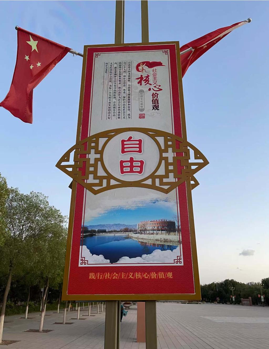 2.拆除图文信息广场灯杆原有灯杆宣传栏,设计制作、安装宣传栏及画面,尺寸:80*198cm,24块,镀锌方管外框,内嵌镀锌铁皮折边焊接,内框二根横杆支撑,在灯杆上高空安装。