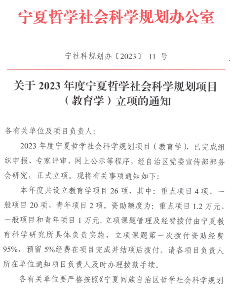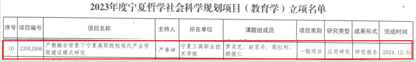 近日,在宁夏社科规划办和宁夏教科所公布的《关于2023年度宁夏哲学社会科学规划项目(教育学)立项的通知》中,能源化工学院副院长严奉坤申报的《产教融合背景下宁夏高职院校现代产业学院建设模式研究》项目顺利获得立项,也是我校唯一获批的项目。该项目将依托宁夏清洁能源现代产业学院(宁东产业学院)、宁夏格瑞产业学院等自治区级及校级产业学院开展职业院校现代产业学院建设模式方面的研究。