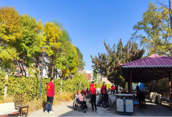 “匠心曙光”志愿者服务队的入党积极分子们对庭院的落叶、树枝、杂草进行仔细清扫,将椅凳擦拭干净。