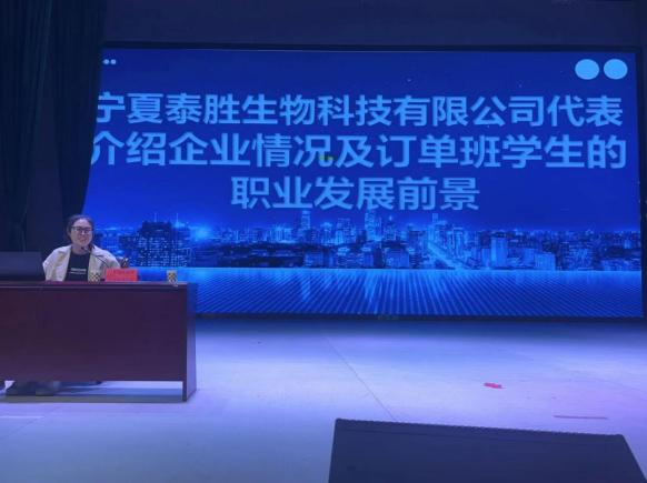 订单班合作企业宁夏惟远新能源有限公司、宁夏泰胜生物科技有限公司分别介绍了企业发展历史、核心业务、企业文化和未来发展方向,并重点讲述了订单班学生在公司中的实习安排和职业发展前景。