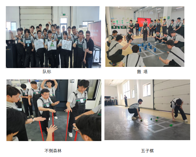 运动会上同学们分成“黄蓝粉”三个小队,每个小队有自己的队标、口号。运动会项目共设置了不倒森林、搬塔、趣味五子棋等多个团体竞赛项目。项目主要体现:目标一致—游戏规则促使队员聚焦共同目标,避免各自为战;信任与默契—如“穿越雷区”需要依赖沟通与信任,更好地培养和提高队员默契程度;优势互补—通过分工协作,可以突出团队中每个成员的优势,能更好地发挥整个团队的核心优势;问题解决—计时挑战锻炼了团队快速决策与资源整合能力,提高工作效率。运动会现场气氛热烈,欢声笑语不断。