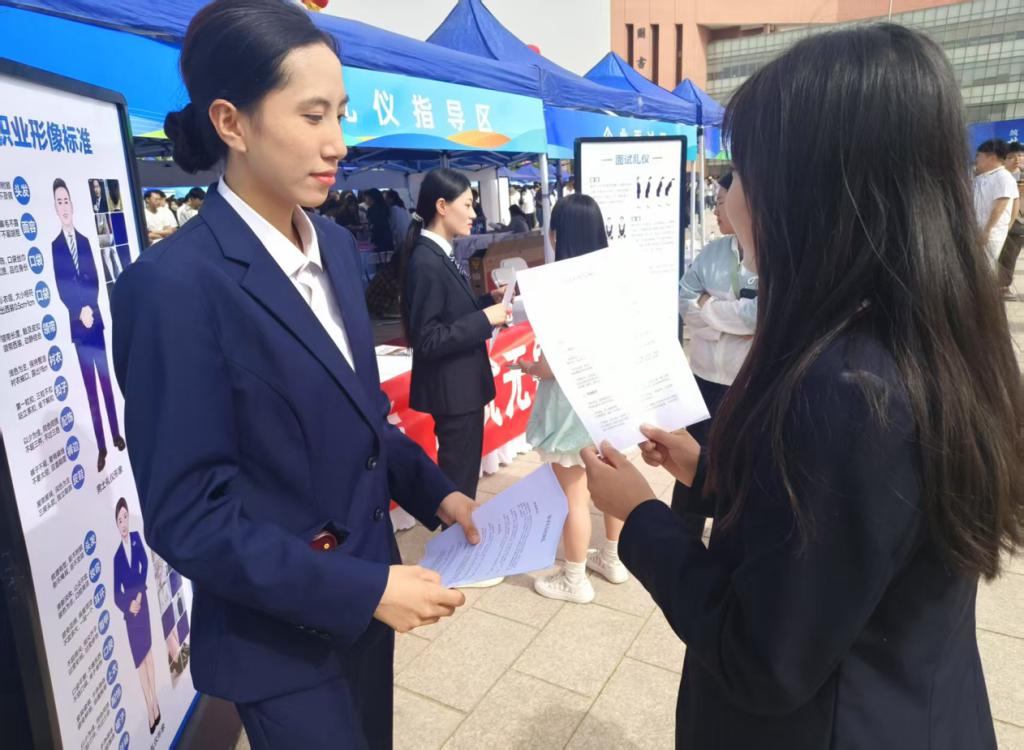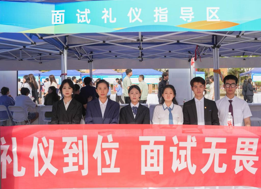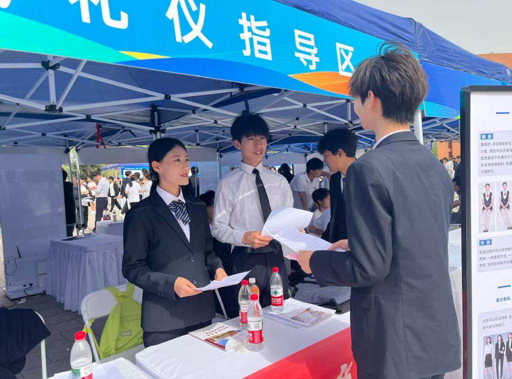 为帮助我校毕业生及求职学生提升面试竞争力,掌握规范面试礼仪,近日,礼仪社积极响应学校号召,在校园双选会现场设立面试指导区,为同学们提供专业的面试礼仪指导服务。