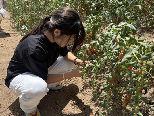 枸杞映朝阳,青春助农忙。中宁的枸杞,是当地乡村振兴的“金色引擎”。队员们走进富硒枸杞种植园,顶烈日、战酷暑,参与采摘分拣,亲尝农耕辛劳,在一滴滴汗水中实现了从最初茫然无措到最后熟练有序的转变。劳作间隙,队员们与农户、合作社负责人交流,希望能够凭借自身专业知识,为中宁枸杞设计宣传海报,真正将所学知识助力家乡产业,将青春力量绽放在乡间地头。