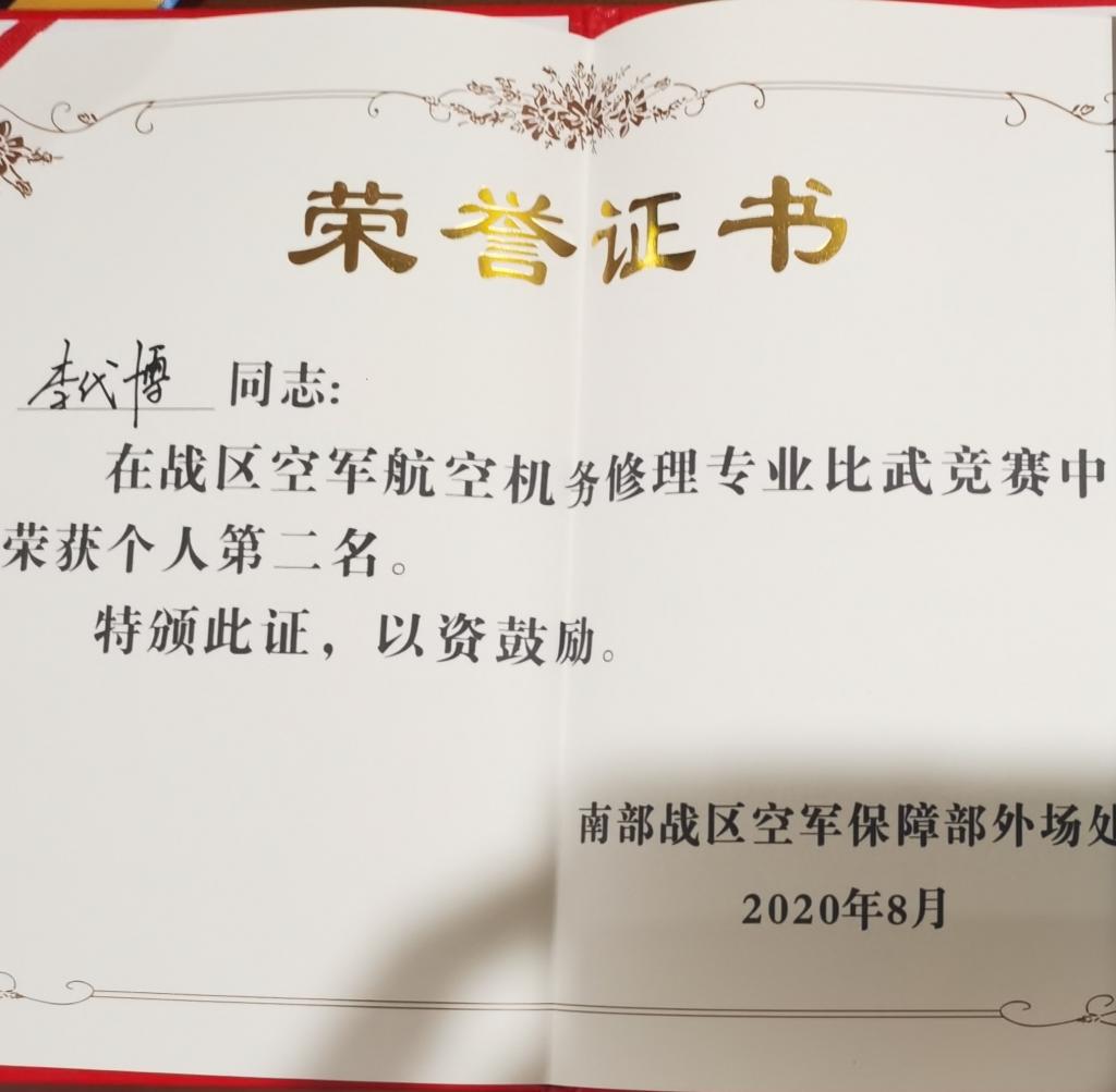 李代博同学是电气与控制工程学院2017级机电一体化专业士官生,2020年7月毕业分配到南部战区空军保障部,在今年8月份南部战区航空机务修理专业大比武竞赛中荣获个人二等奖,记个人三等功一次,是我校士官生一进部队就建新功的第一个佳音。