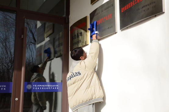 一部分学生以楼宇为单位,擦拭校内所有的牌匾,并负责捡拾楼宇内外所有地面垃圾。