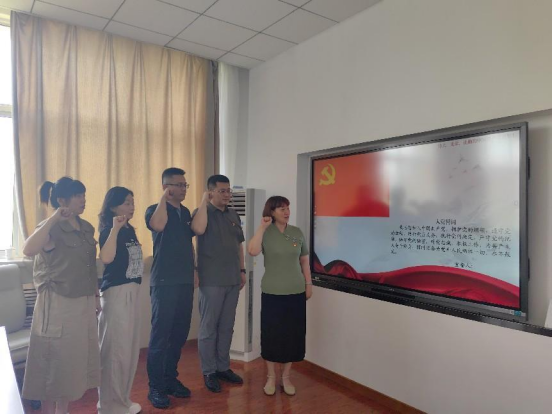 随后支部书记带领全体党员重温入党誓词。同志们齐聚在党旗下,举起右拳,在支部书记的带领下庄严宣誓。