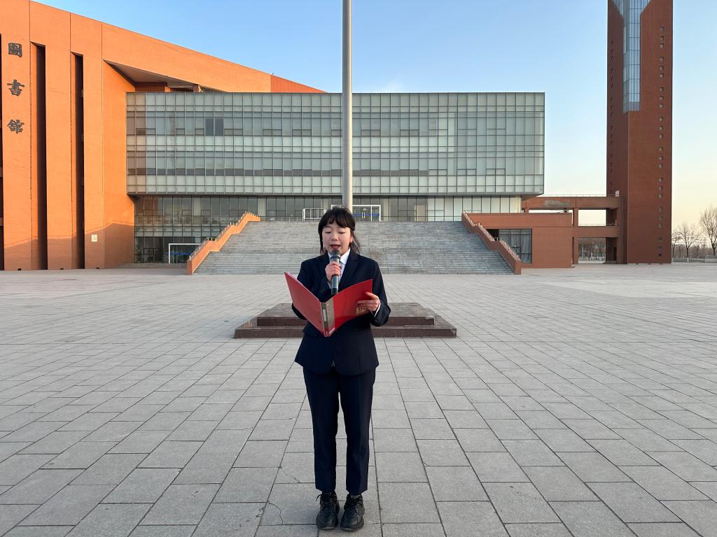 学生代表李玲在国旗下演讲,她号召全体同学要挺膺担当,铸牢中华民族共同体意识,维护民族团结,做合格的新时代大学生,做合格的新时代青年!