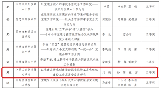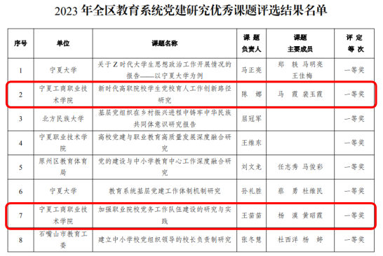 其中,由陈娜等申报的《新时代高职院校学生党校育人工作创新路径研究》和王苗苗等申报《加强职业院校党务工作队伍建设的研究与实践》课题被评定为一等奖;刘亮等申报的《以党建品牌化创建推动职业院?;愕匙橹ㄉ韫ぷ鞲咧柿糠⒄寡芯俊房翁獗黄蓝ㄎ冉?。