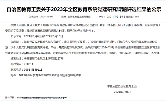 3月6日,自治区教育厅官网发布了《自治区教育工委关于2023年全区教育系统党建研究课题评选结果的公示》,我校3项课题拟获全区教育系统党建研究优秀课题。