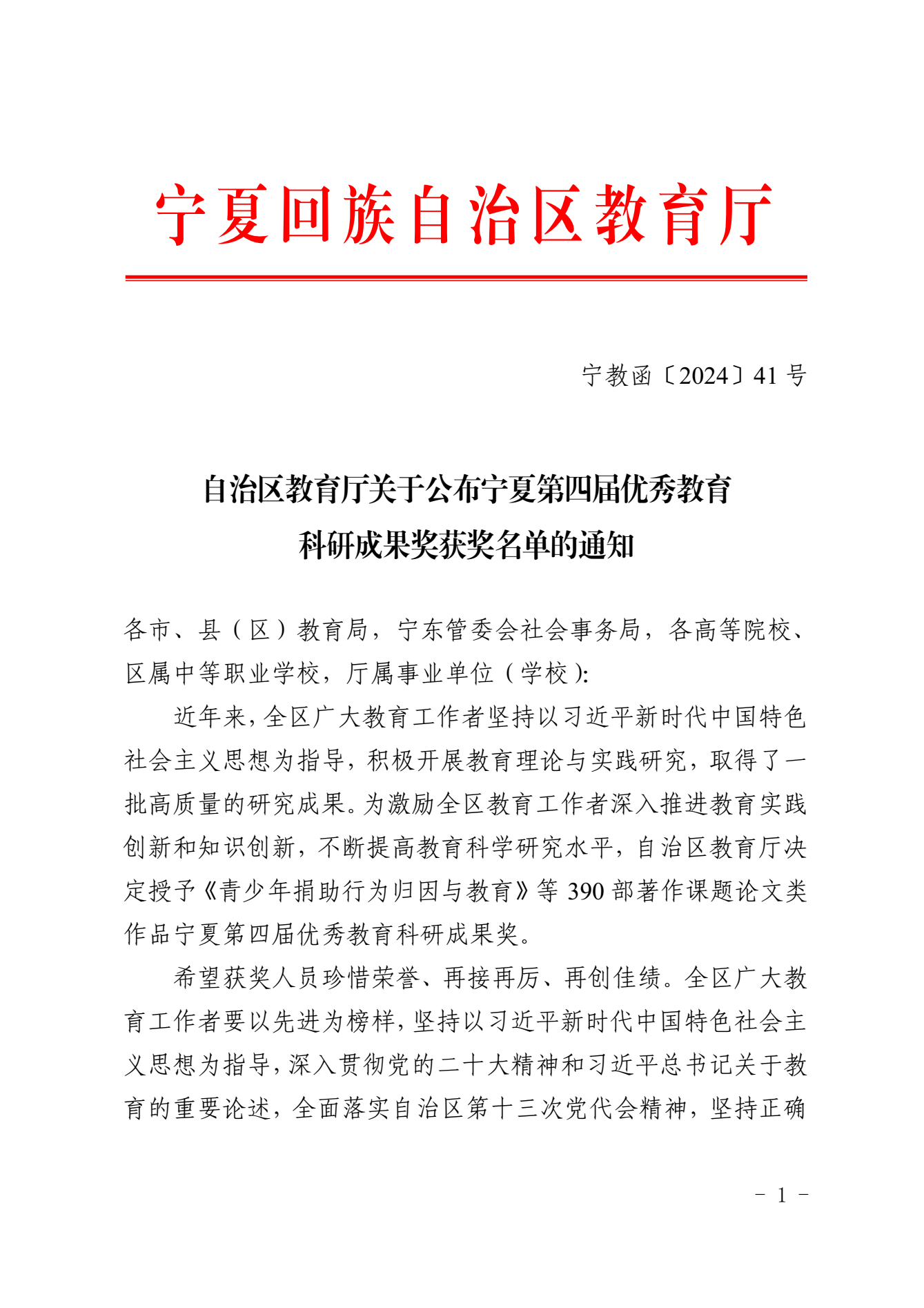 近日,自治区教育厅发布了《自治区教育厅关于公布宁夏第四届优秀教育科研成果奖获奖名单的通知》文件,我校2项科研成果获一等奖,1项科研成果获二等奖,3项科研成果获三等奖。