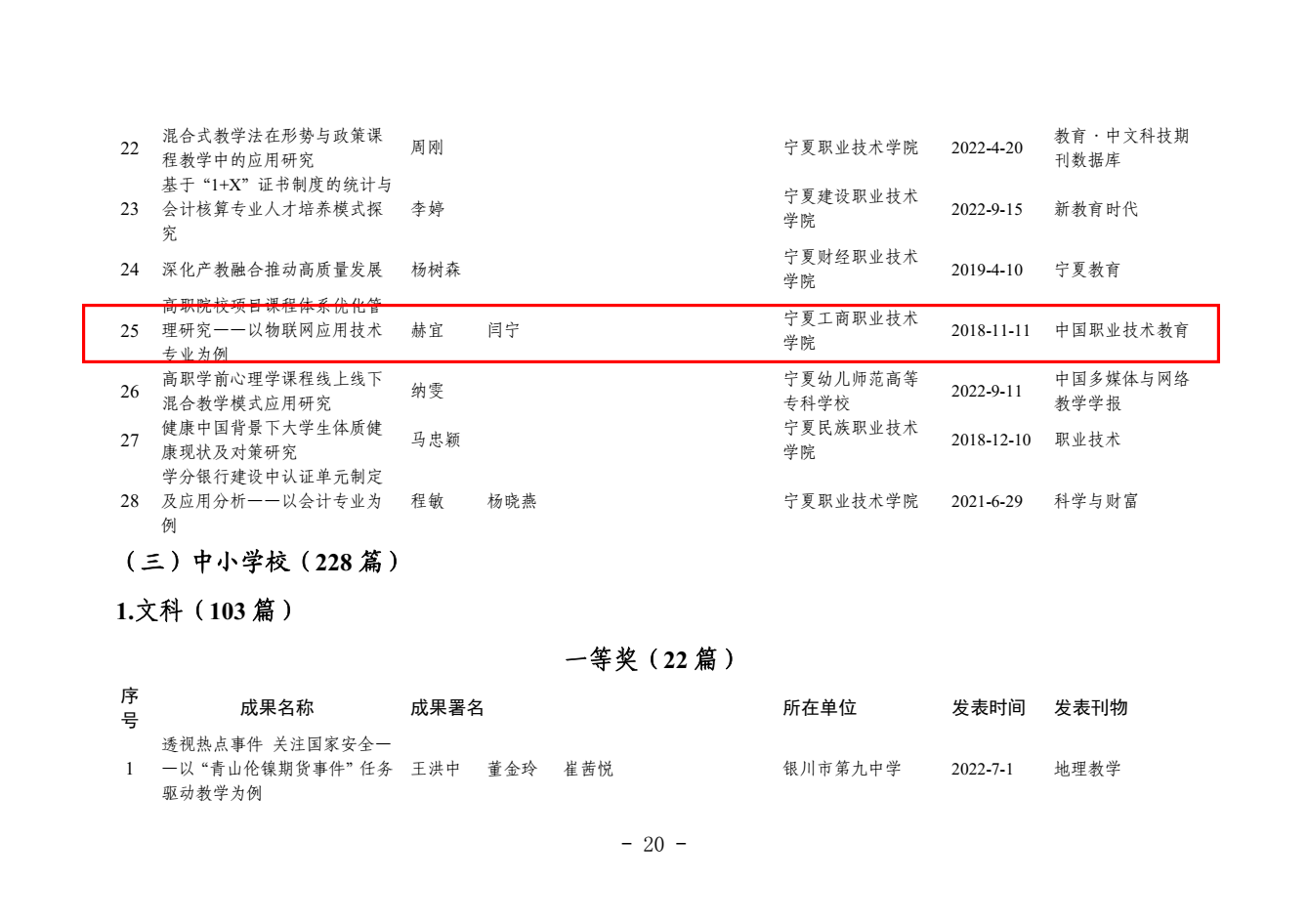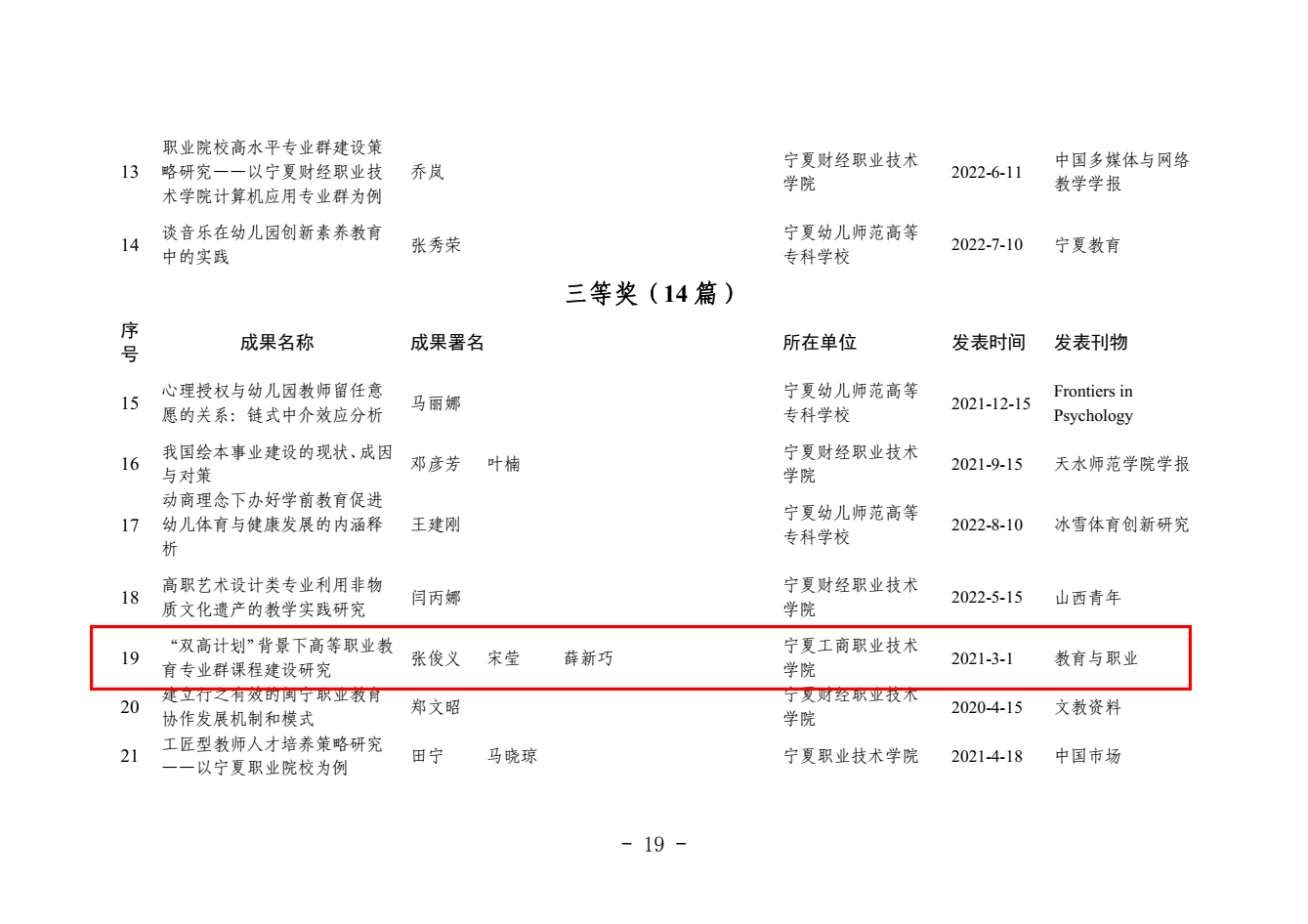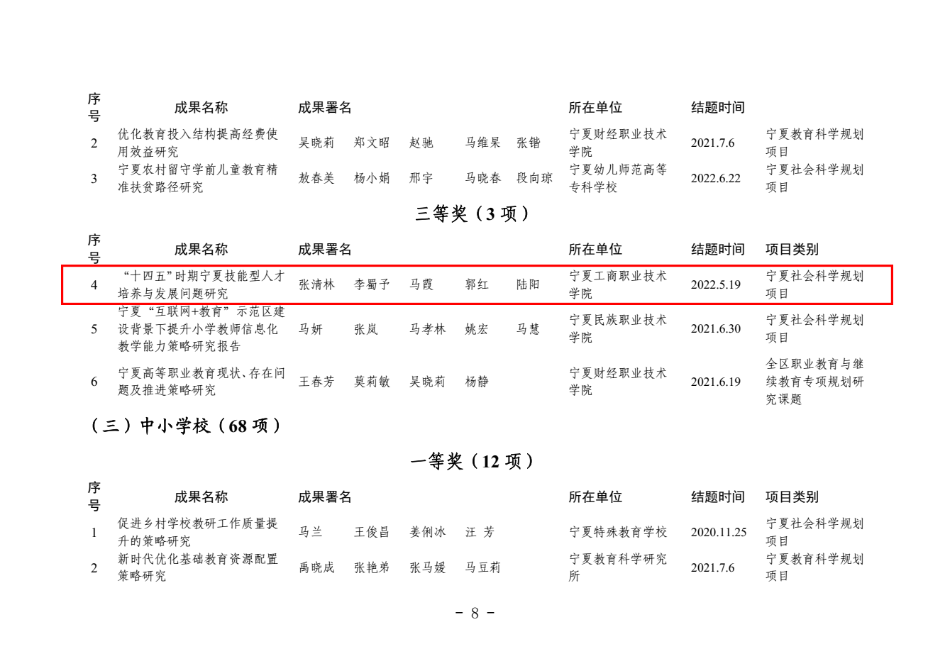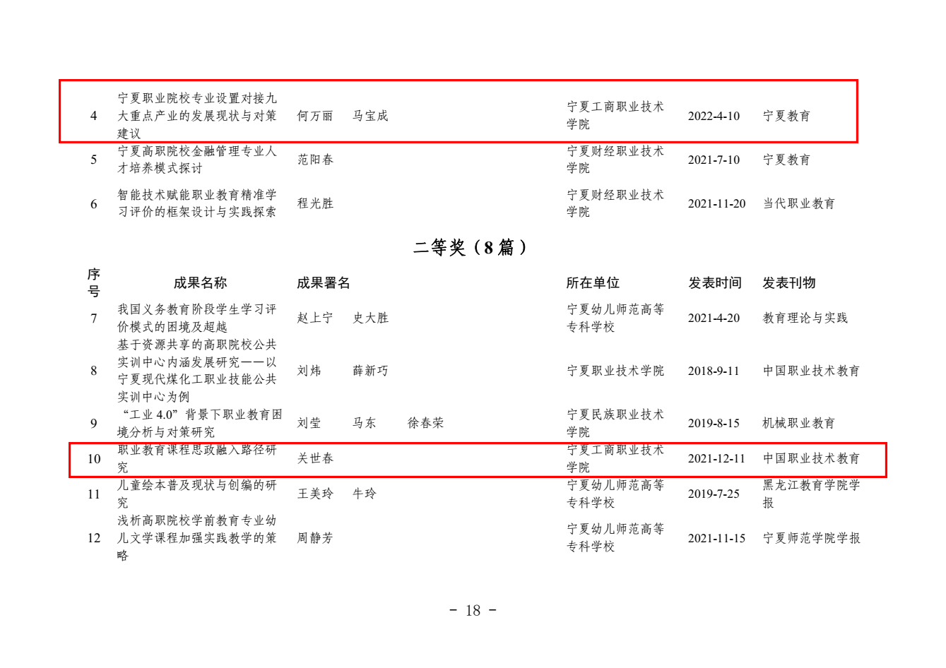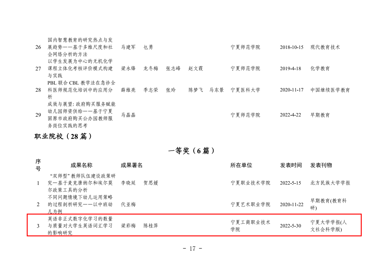 其中,梁彩梅申报的《英语非正式数字化学习的数量与质量对大学生英语词汇学习的影响研究》、何万丽申报的《宁夏职业院校专业设置对接九大重点产业的发展现状与对策建议》获论文类一等奖;关世春申报的《职业教育课程思政融入路径研究》获论文类二等奖;张俊义申报的《“双高计划”背景下高等职业教育专业群课程建设研究》、赫宜申报的《高职院校项目课程体系优化管理研究——以物联网应用技术专业为例》获论文类三等奖;张清林申报的《“十四五”时期宁夏技能型人才培养与发展问题研究》获课题类三等奖。
